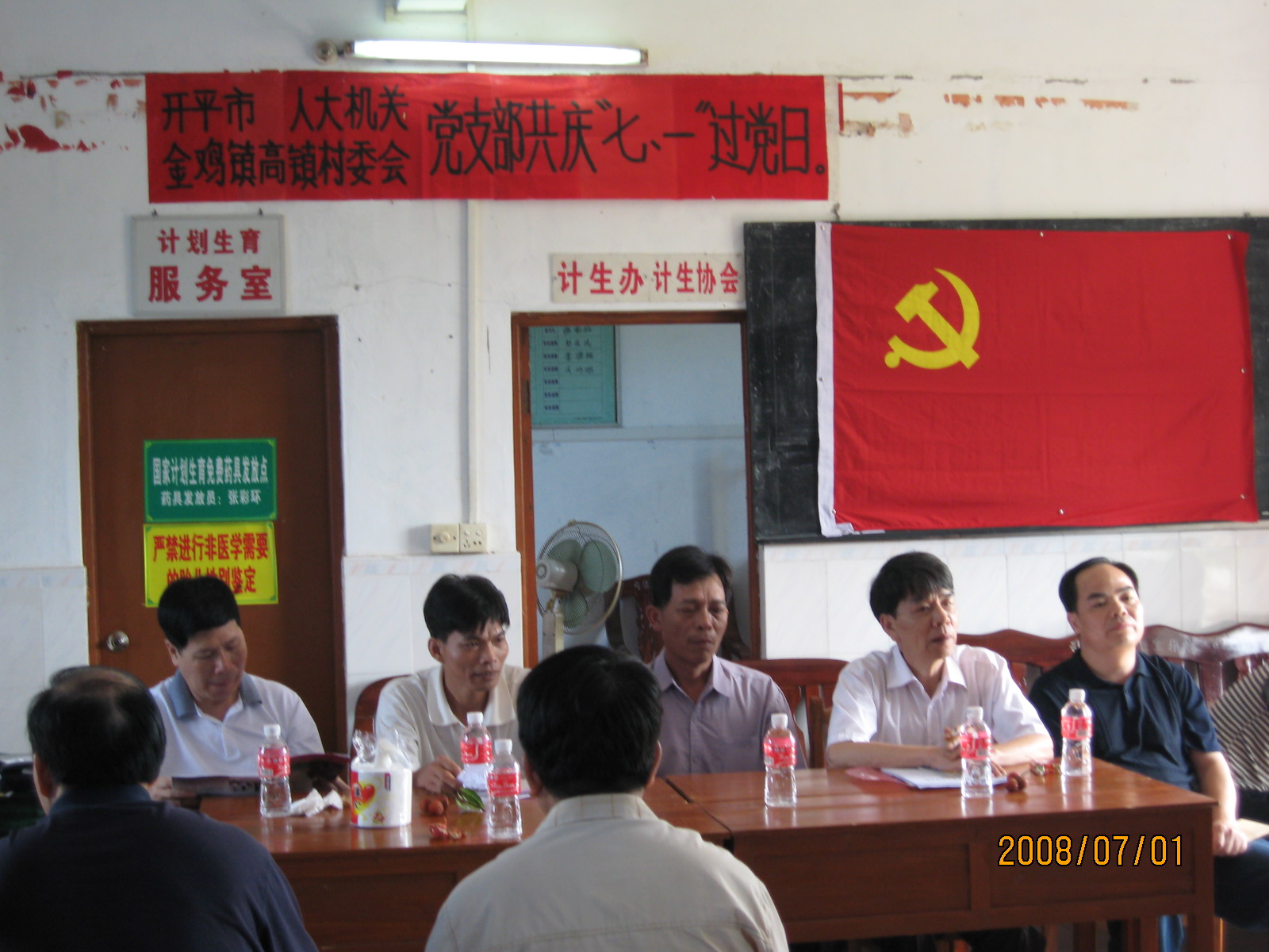 7月1日上午,市人大机关党支部的党员来到了与之结对的金鸡镇高镇村,两个党支部40多人一起召开了专题生活会,共庆中国共产党成立87周年的大喜日子。与会党员共同回顾我党成立87周年光辉历程,畅谈改革开放30周年的农村新发展、新变化,探讨如何发挥好本村靠近圩镇地理优势,推动村经济发展,推进社会主义新农村建设。市人大机关党支部还给四位80岁以上的老党员送上慰问金。