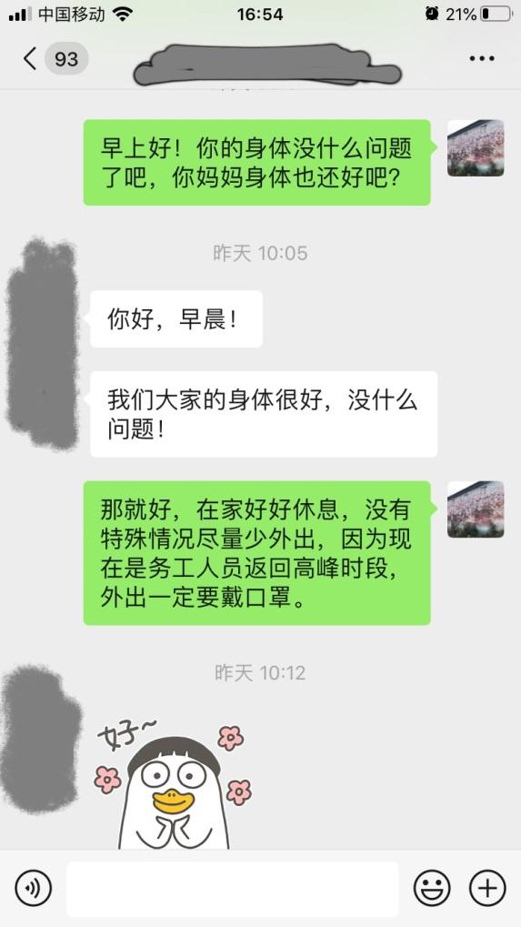 “疾控解除我们的医学隔离了,谢谢你这段时间对我们一家人的照顾,辛苦晒!”这是关雪英今年以来听到的最好的消息,“不辛苦,能听到你们的好消息我就放心了。”