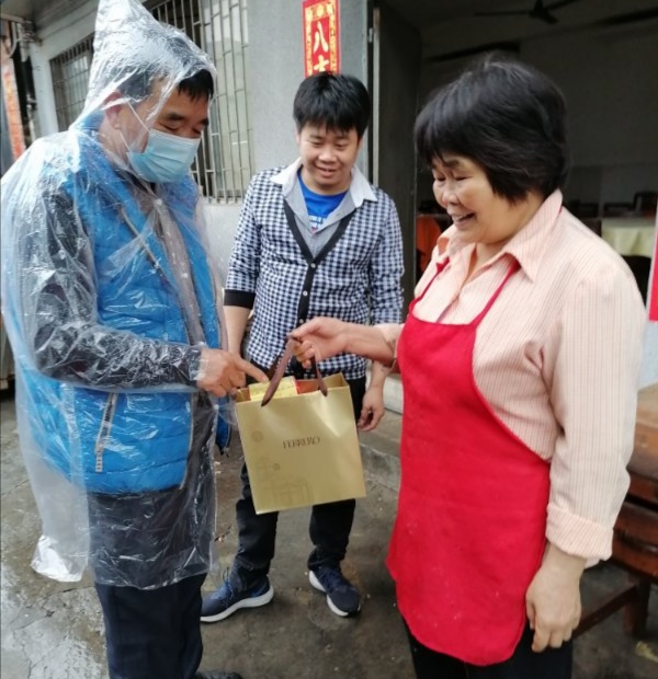 方焯健(左一)冒雨为群众送物资