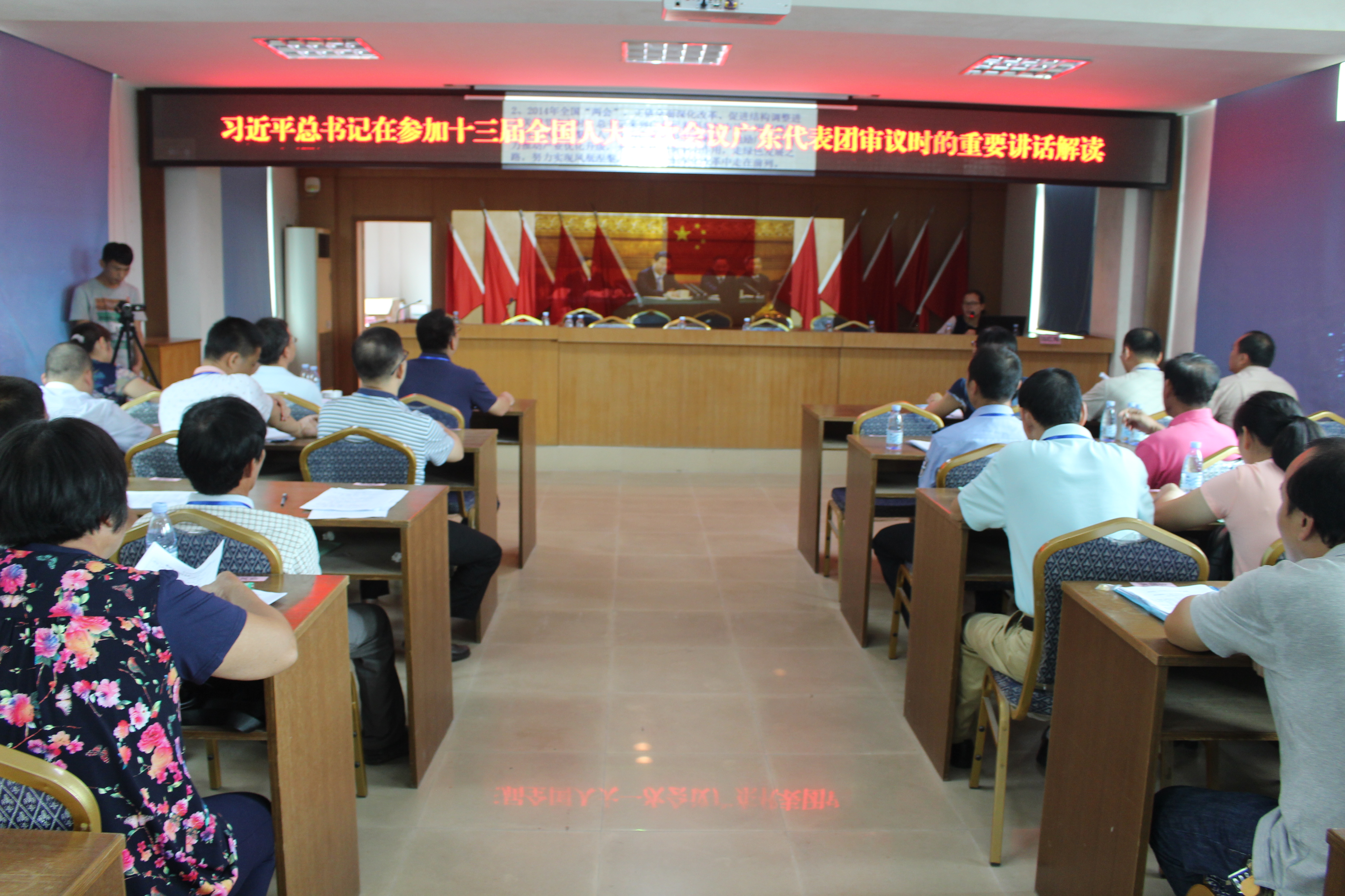 会议邀请了市委党校陈红梅老师为全体与会人员授课,解读了《习近平总书记在参加十三届全国人大一次会议广东代表团审议时的重要讲话》。