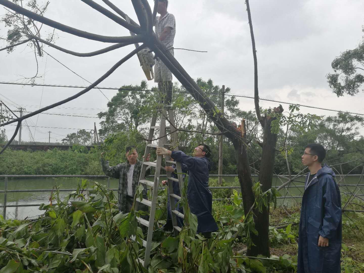 镇人大副主席黄志坚带领镇、村干部在清理被大风吹折的树木