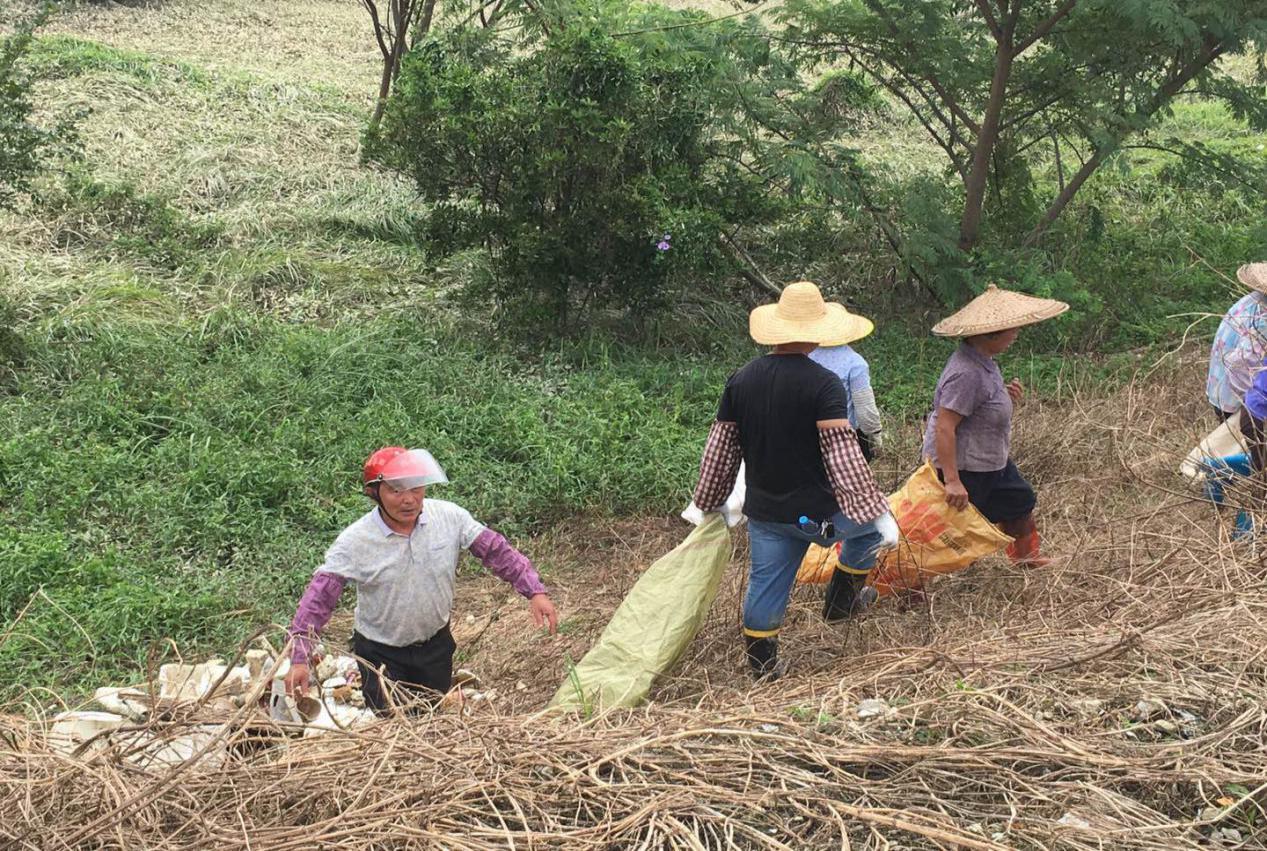 镇人大代表谭卓权灾后清理河堤垃圾