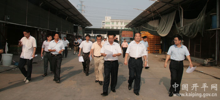1028日,江门市人大副主任伍国占一行10人来到开平,调研我市支农惠农政策落实情况,受到开平市领导司徒尧滚、苏树栋的欢迎。当天,伍国占一行在听取了开平市副市长苏树栋有关支农惠农政策落实情况的汇报后,并深入到开平市绿皇家禽批发市场和镇海供水工程公司实地考察、调研,广泛听取基层群众的意见和建议。