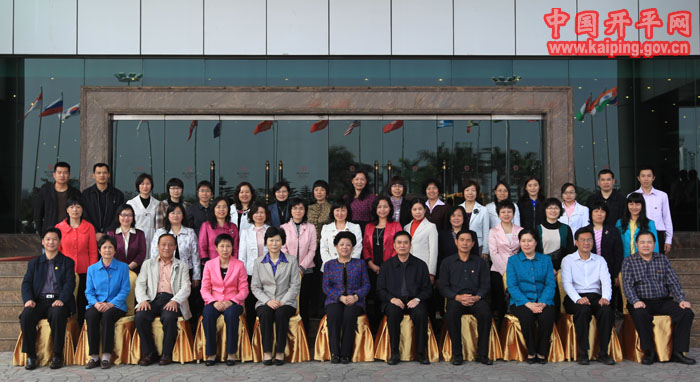 陈至立副委员长(前排中)亲切接见了江门市基层妇联干部代表,并与大家合影留念