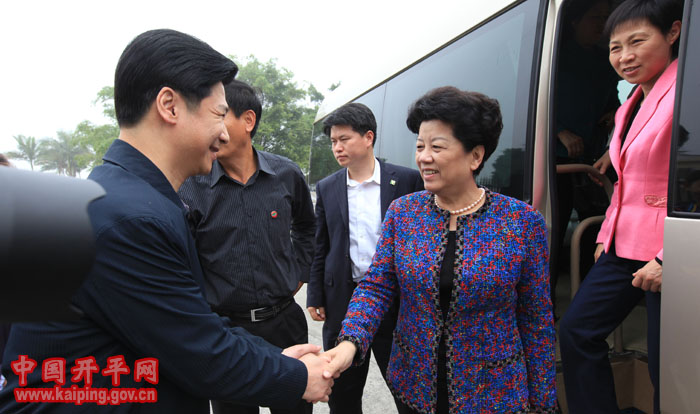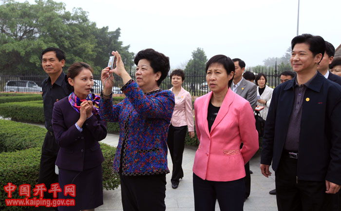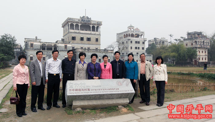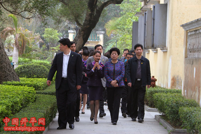 2月28日上午,全国人大常委会副委员长、全国妇联主席陈至立,在全国妇联副主席陈秀榕、省人大常委会副主任陈小川、省妇联副主席徐春莲等的陪同下,到我市考察世界文化遗产开平碉楼与村落,并与我市妇女代表见面。江门市领导陈继兴、梁清兆、黄悦胜、蓝月华,开平市领导冯立坚、黄耀雄、陈伟成、张星杰对陈至立副委员长的到来表示欢迎并陪同考察。