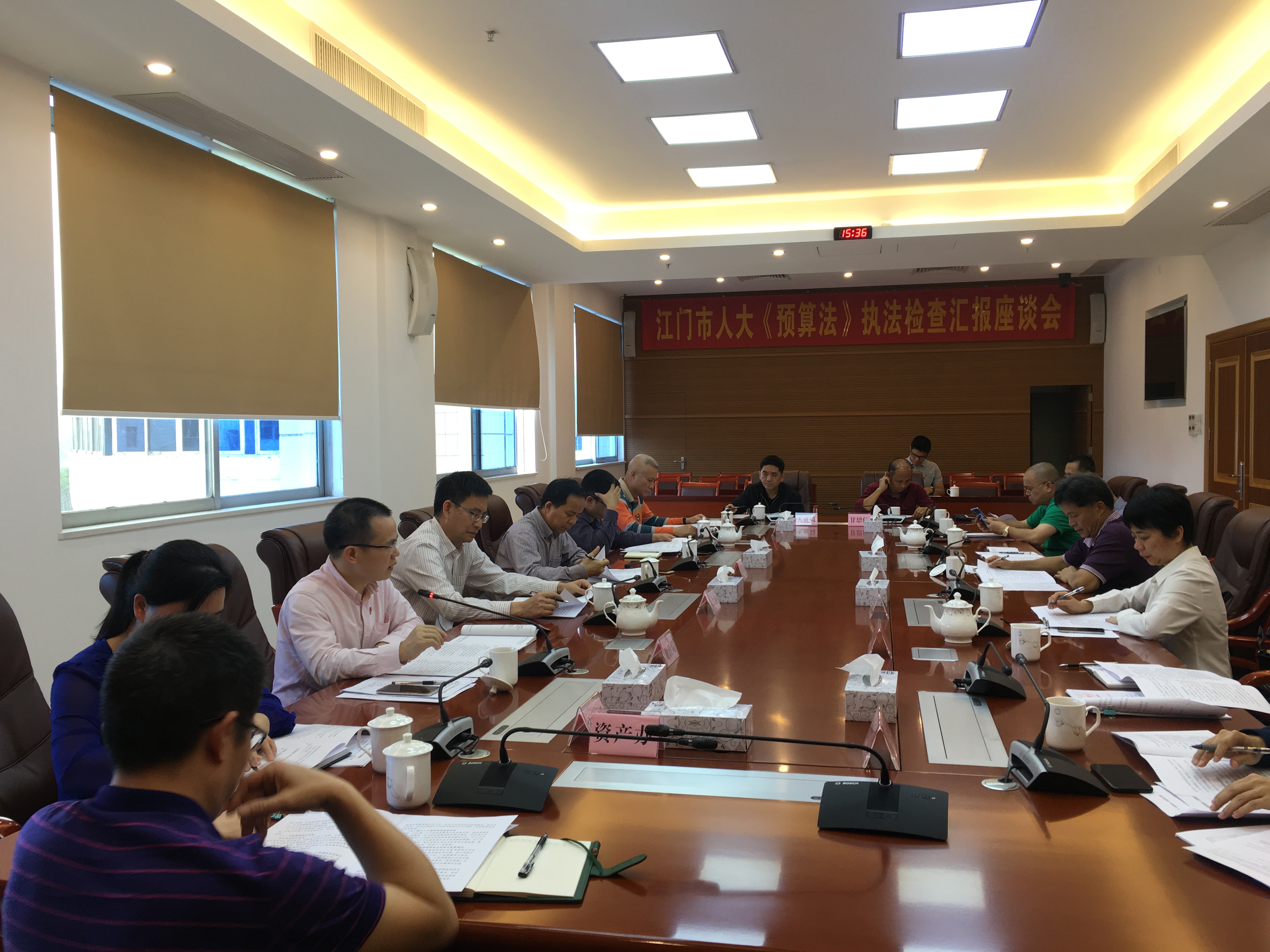 4月17日,江门市人大执法检查组到开平市召开《中华人民共和国预算法》实施情况执法检查座谈会,听取了开平市贯彻落实《中华人民共和国预算法》的总体情况,肯定了开平市贯彻落实《中华人民共和国预算法》的工作,并提出了一些建议意见。开平市人大常委会副主任邝业礼陪同参加座谈。(市人大常委会财经城建环保工委)