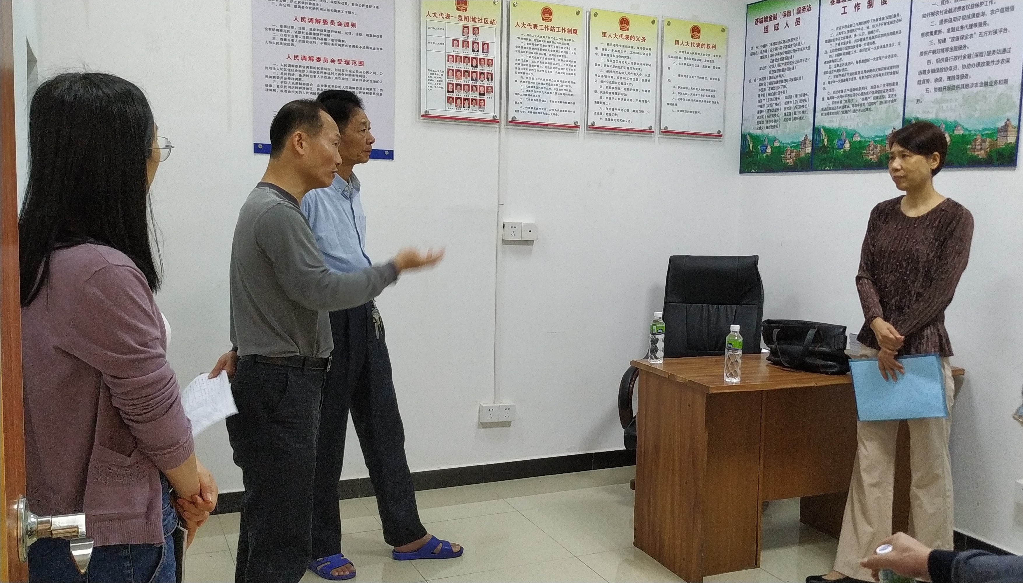 吉喆一行先后到苍城镇墟社区居委会、下湾村委会两个地点调研人大代表工作站的建设,听取了居委会主任许宜旺和下湾村委会书记、主任谢宵伦关于村(居)委会建设人大代表工作站的基本情况。